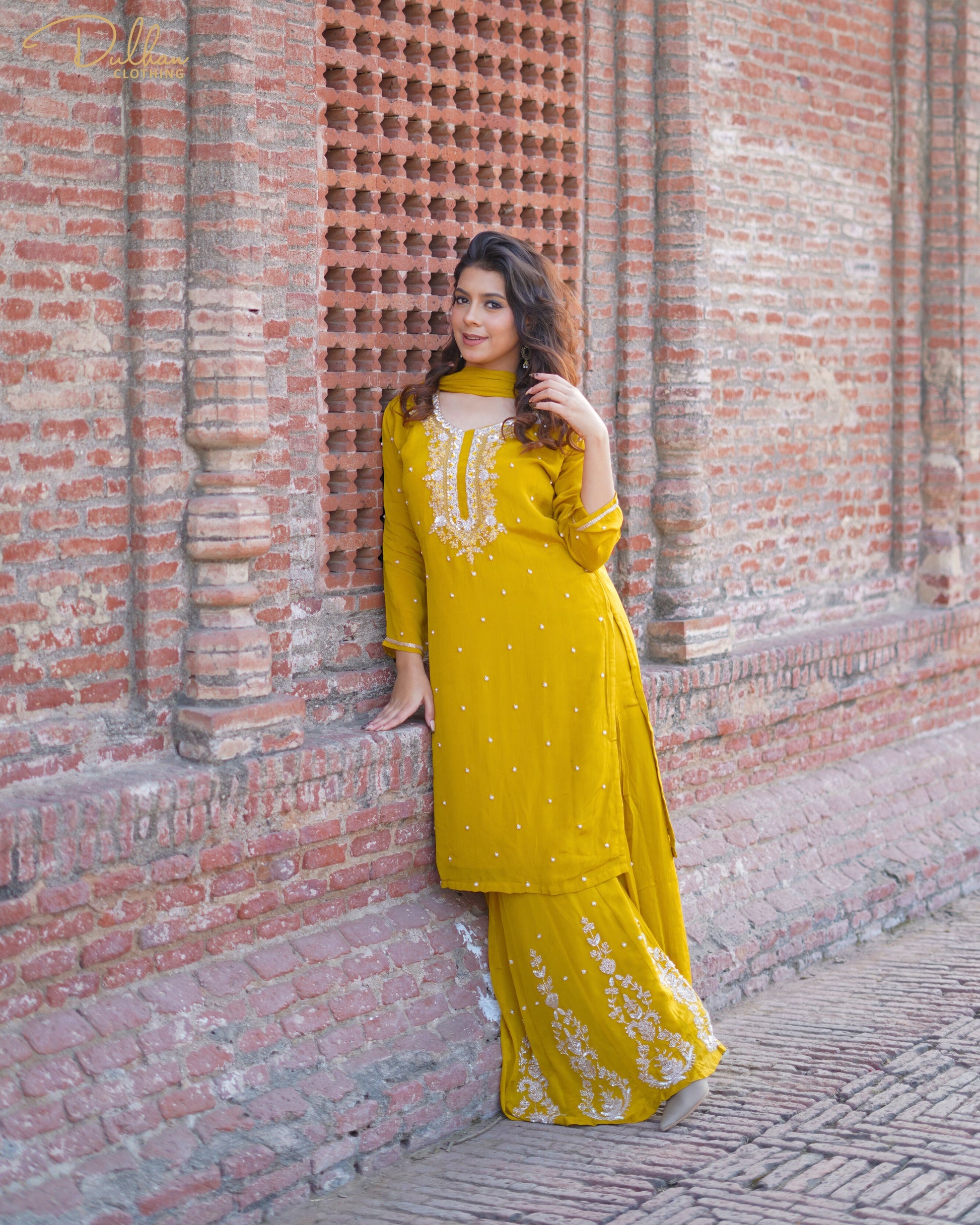 Add festive charm to your ethnic wardrobe with this elegant mustard embroidered kurta set. Designed with delicate embroidery on the neckline and palazzo hem, this outfit offers a perfect balance of tradition and comfort, ideal for celebrations and day events.