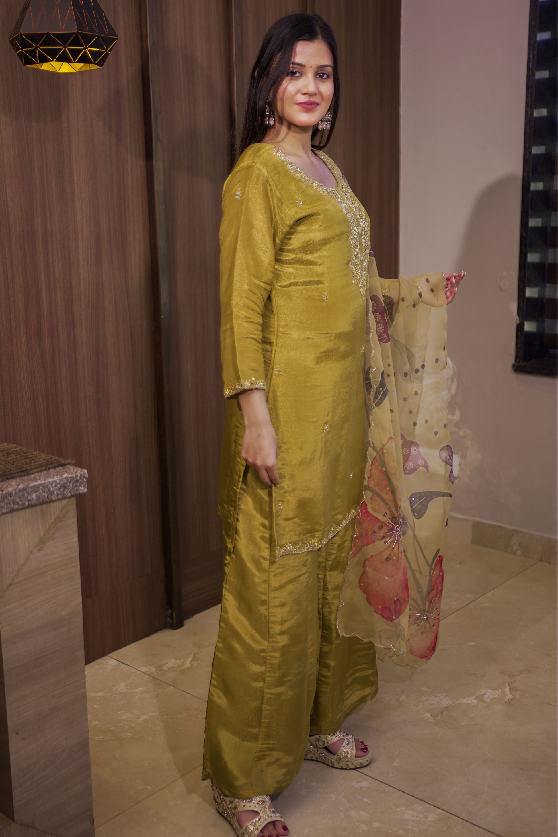 This elegant mustard silk-blend suit set features delicate hand-style embroidery on the neckline and sleeves, paired with a soft, printed organza-style dupatta showcasing floral motifs. The set includes a straight-fit kurta and matching pants, offering a graceful festive and semi-traditional look perfect for family functions, celebrations, and special occasions.
